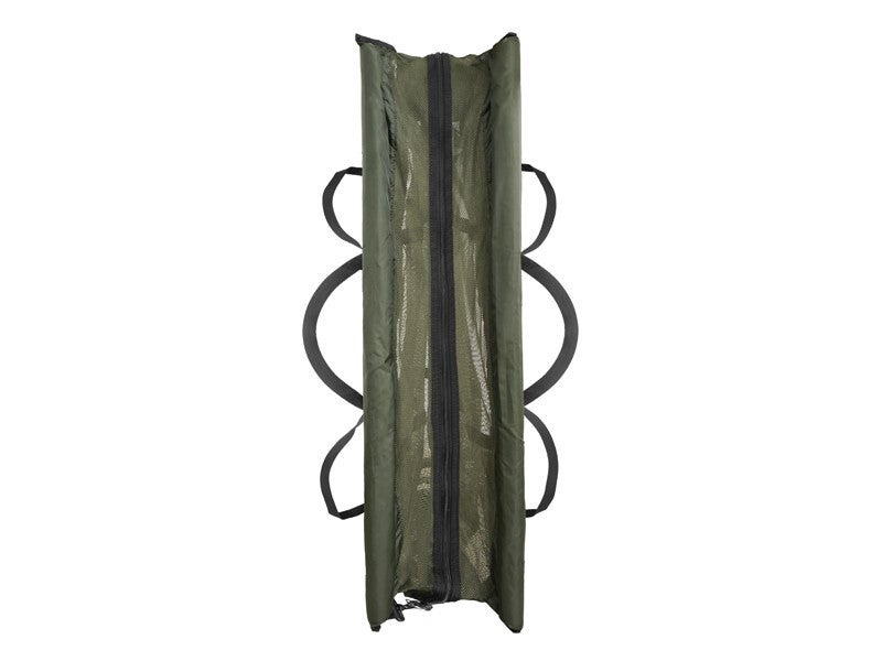 Het gaas is in het midden verstevigd met twee zwarte textielriemen die aan de weegschaal kunnen worden gehangen. De tas heeft aan beide zijden textiele handgrepen voor gemakkelijk transport. Een grote rits aan beide zijden en aan de bovenkant zorgt ervoor dat de CWS bijna volledig kan worden opengeritst voor een betere grip op uw vangst.